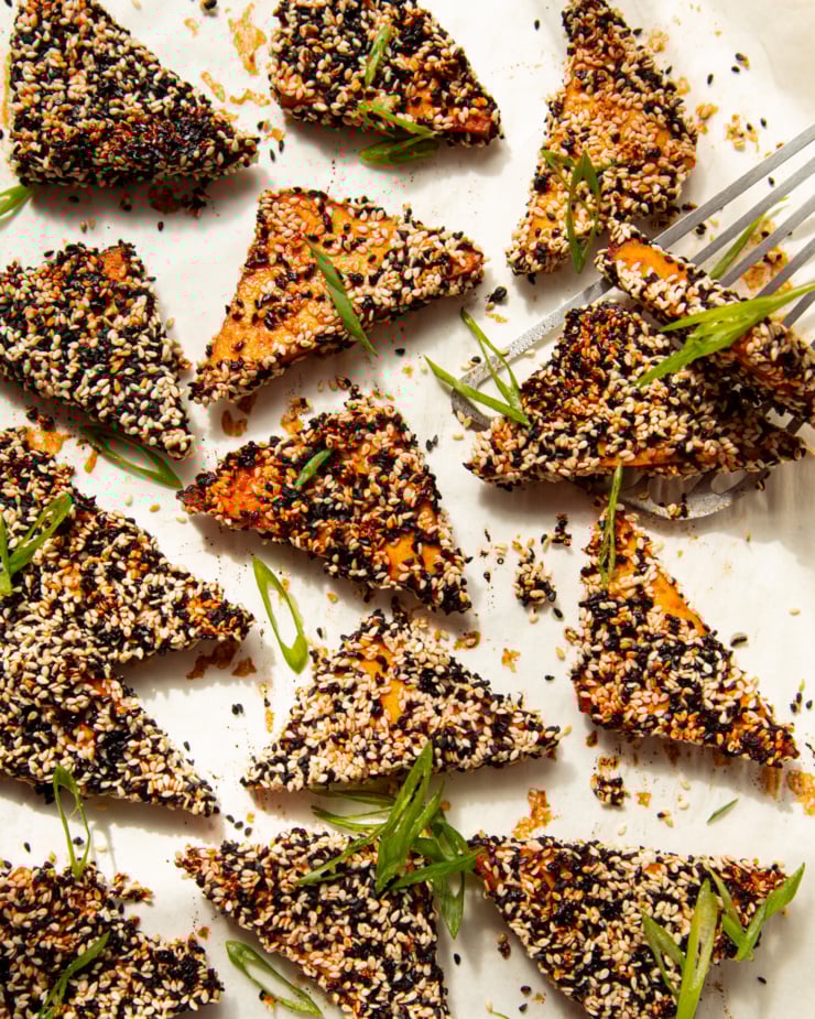 - Enjoy the sesame tofu triangles on grain bowls, salads etc! I like to garnish with sliced green onions.